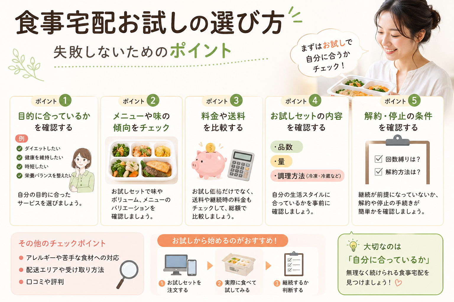 食事宅配のお試しを利用する際には、いくつかの重要なポイントを押さえておくことが大切です。適当に選んでしまうと、自分のライフスタイルに合わず、満足度が低くなってしまう可能性があります。ここでは、失敗しないための選び方を詳しく解説します。
