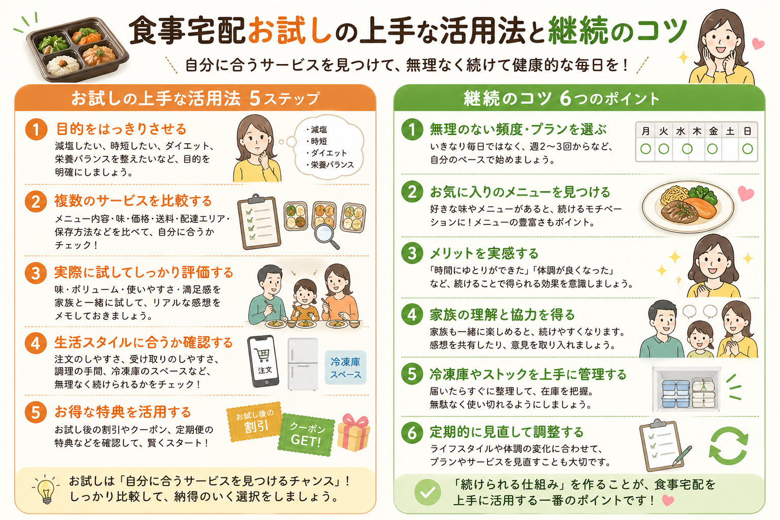 食事宅配のお試しを最大限に活用するためには、単に試すだけでなく、目的を持って利用することが重要です。ここでは、お試しを有効に活用する方法と、継続するためのコツについて解説します。